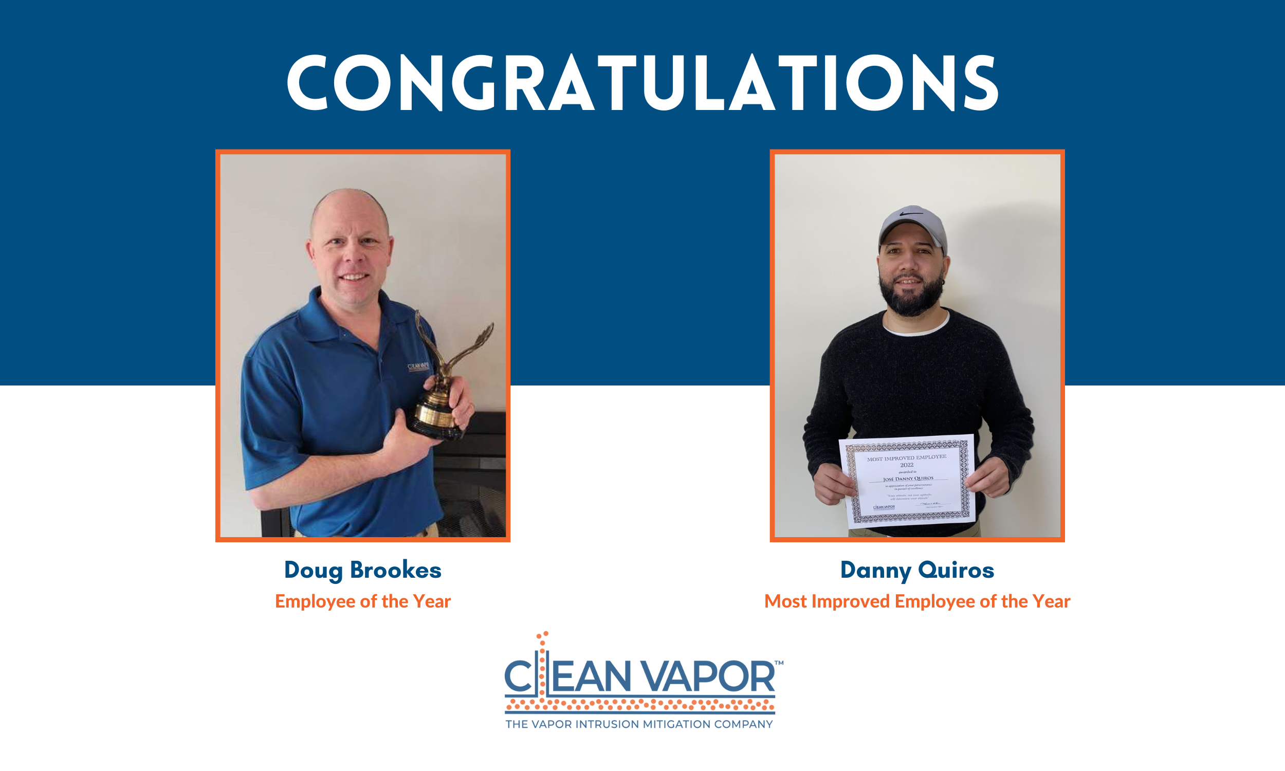 Congratulations to Doug Brookes, Construction Director, for achieving Employee of the Year and Danny Quiros, OM&M Manager, for becoming the most improved Employee of the Year! We thank these team members for everything they do for Clean Vapor and for embodying the mission, dedication, and perseverance, among many other beneficial attributes. We are lucky to have these individuals working with us!